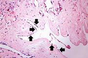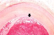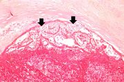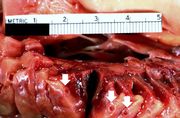 | 16:36, 19 August 2013 | IPLab2Calcification7.jpg (file) | 59 KB | Peter Anderson | A closer view of this same aortic valve (arrow) illustrates the nodularity and thickening of this valve. This valve would be extremely stiff and almost entirely immobile. This particular example of dystrophic calcification is associated with a degenera... | 1 | |