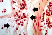 | 03:47, 21 August 2013 | IPLab9BacterialMeningitis5.jpg (file) | 78 KB | This is a higher-power photomicrograph of inflammatory exudate in a sulcus. The majority of cells in this exudate are neutrophils. There is also abundant fibrin (arrows) and red blood cells are present in the congested vessels. | 1 | |