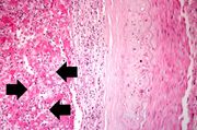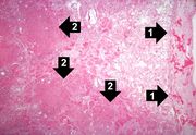 | 04:06, 21 August 2013 | IPLab10Histo4.jpg (file) | 78 KB | This high-power photomicrograph was taken at the edge of the area of necrosis. There is a mild inflammatory infiltrate along the edge of the necrosis. | 1 | |