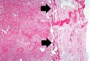 | 04:16, 21 August 2013 | IPLab10Blasto5.jpg (file) | 79 KB | This is a higher-power photomicrograph of lung section with pleura. The pleura (arrows) is thickened and contains inflammatory cells and fibrin. The alveoli are filled with inflammatory cells. Some of the alveolar septa are congested with red blood cells. | 1 | |