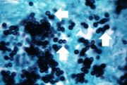 | 04:13, 21 August 2013 | IPLab10Crypto12.jpg (file) | 43 KB | This is a touch prep of fresh lung tissue that was allowed to air dry and then stained to show the mucopolysaccharide capsule around the cryptococcal organisms (arrows). | 1 | |
